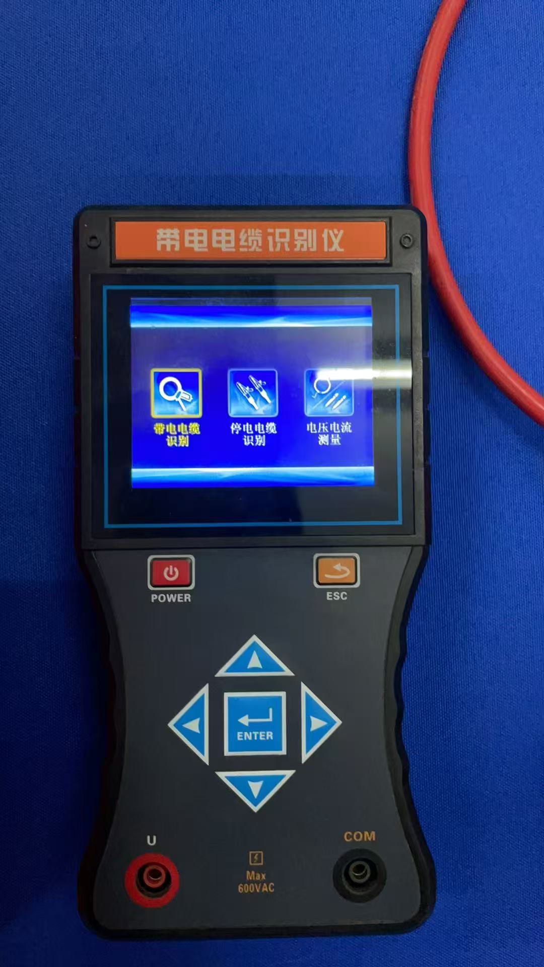 接收機:為手持設備,3.5寸彩色液晶屏,內置高速微處理器,結合精準算法,對發射機的脈沖編碼電流信號進行識別并解碼,同時具有信號強度標定功能,顯示信號強度和檢測結果,精美直觀;彩色刻度條動態顯示,一目了然,電纜識別成功打√,非目標電纜打×,能快速自動識別目標電纜。同時可測試電壓量程為AC 0.00V~600V(50Hz/60Hz),可測交流電流量程為AC 0.00A~5000A(50Hz/60Hz),可測電流頻率45Hz~70Hz。